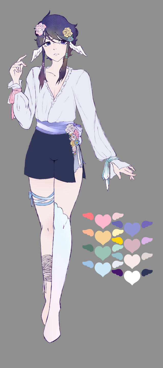 Physical characteristics: Heterochromatic blue/purple eyes, White skin, Multicoloured dark hair, White ear wings