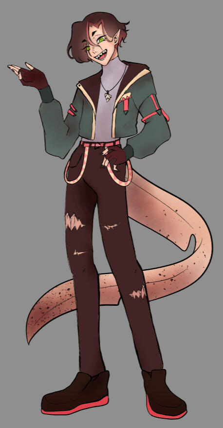 Physical characteristics: Green eyes, Short brown hair with faded red streaks and underlayer, Sharp teeth, Pointy ears, Tall