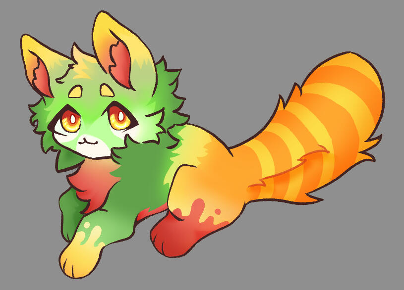 Physical characteristics: Reddish orange eyes, Bright citrus fur, Striped tail, Dipped paws, White Muzzle