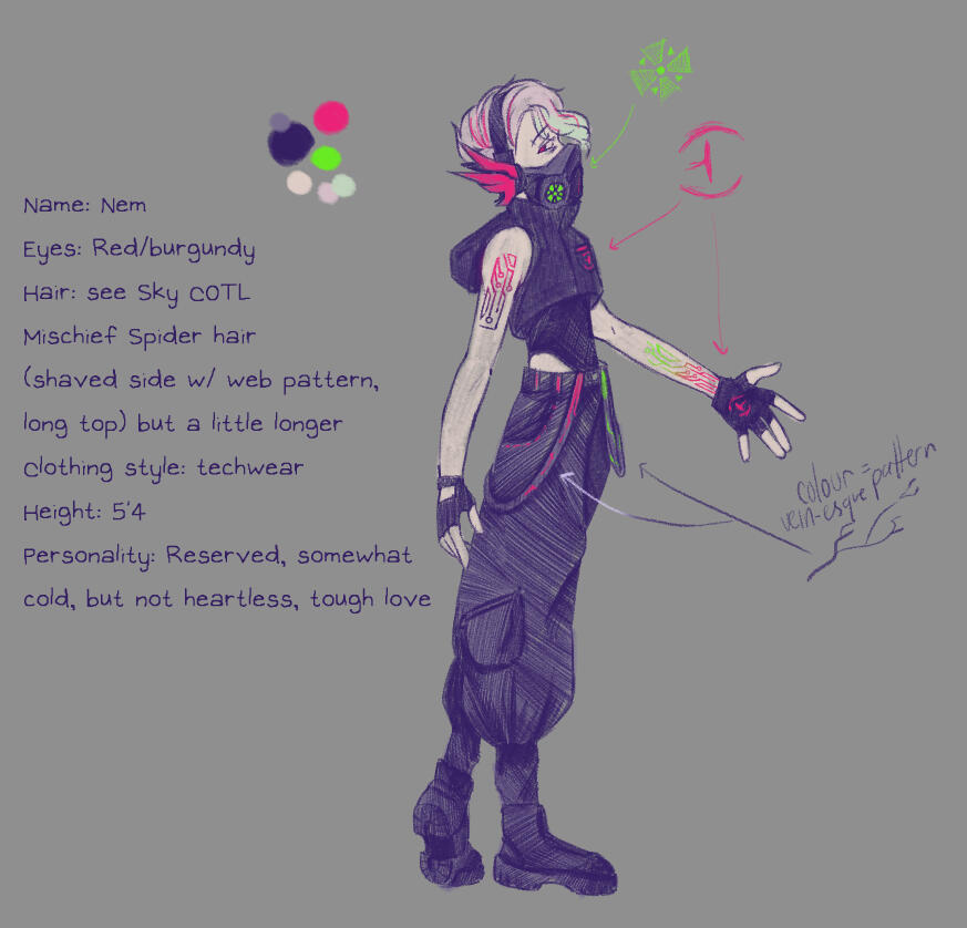 Physical characteristics:Burgundy/Red eyes, Short light pink hair with red streaks and (optional) slightly dyed tips (colours change, bro likes colours), Data chip tattoos (black, red, green ink, feel free to play around with it), Fair skin, Peirced ears + left eyebrow, Somewhat short