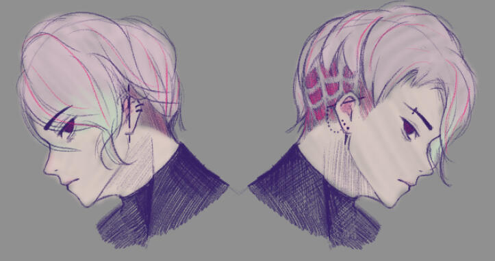 Physical characteristics:Burgundy/Red eyes, Short light pink hair with red streaks and (optional) slightly dyed tips (colours change, bro likes colours), Data chip tattoos (black, red, green ink, feel free to play around with it), Fair skin, Peirced ears + left eyebrow, Somewhat short